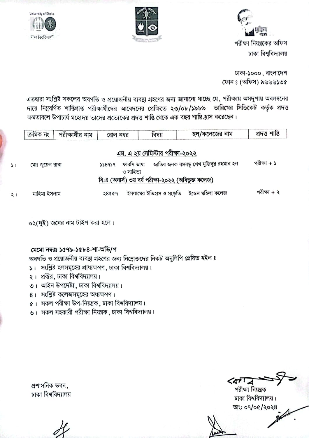 24.11.2025 শাস্তির তালিকা, ঢাকা বিশ্ববিদ্যালয়। |
